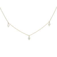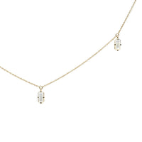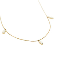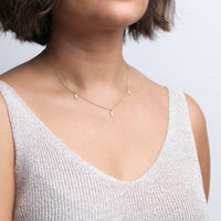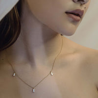 Each charm is placed to highlight the sensuous collarbone. The iridescent milky tone selected for this necklace adds a little light to the minimalist and delicate nature of the piece.
