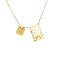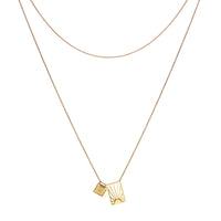 The necklace features two pendants; minimalist palm fronds as a nod to TSF's Malaysian heritage and the other, a square solid polished pendant is a square with a subtle etching of our logo.