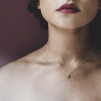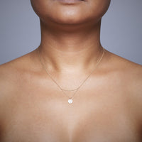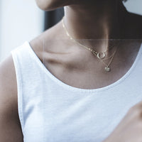 A lightly hammered solid disc sits like the rising sun on a delicate 1mm chain. As you move, the hanging pendant alters the triangle chain detail - playing with angles and geometry all the time.
