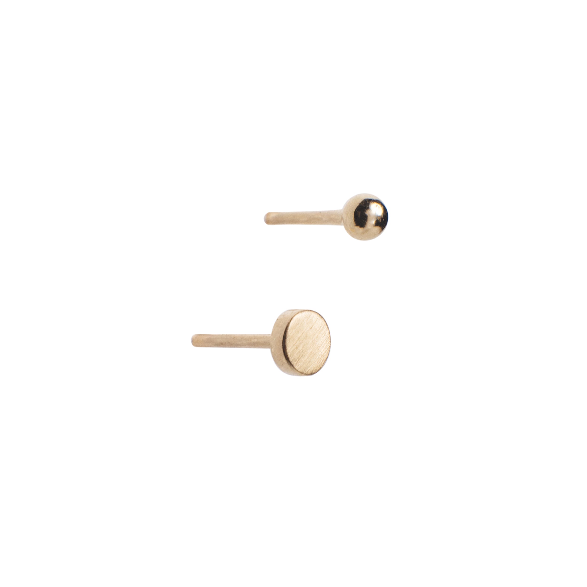 The Tic Tac; a pair of mismatched stud earrings in 14k solid gold. A tiny high polished sphere on one side and on the other, a flat disc with a brushed metal finish. Pairs fabulously when mixed and matched with other earrings as well!